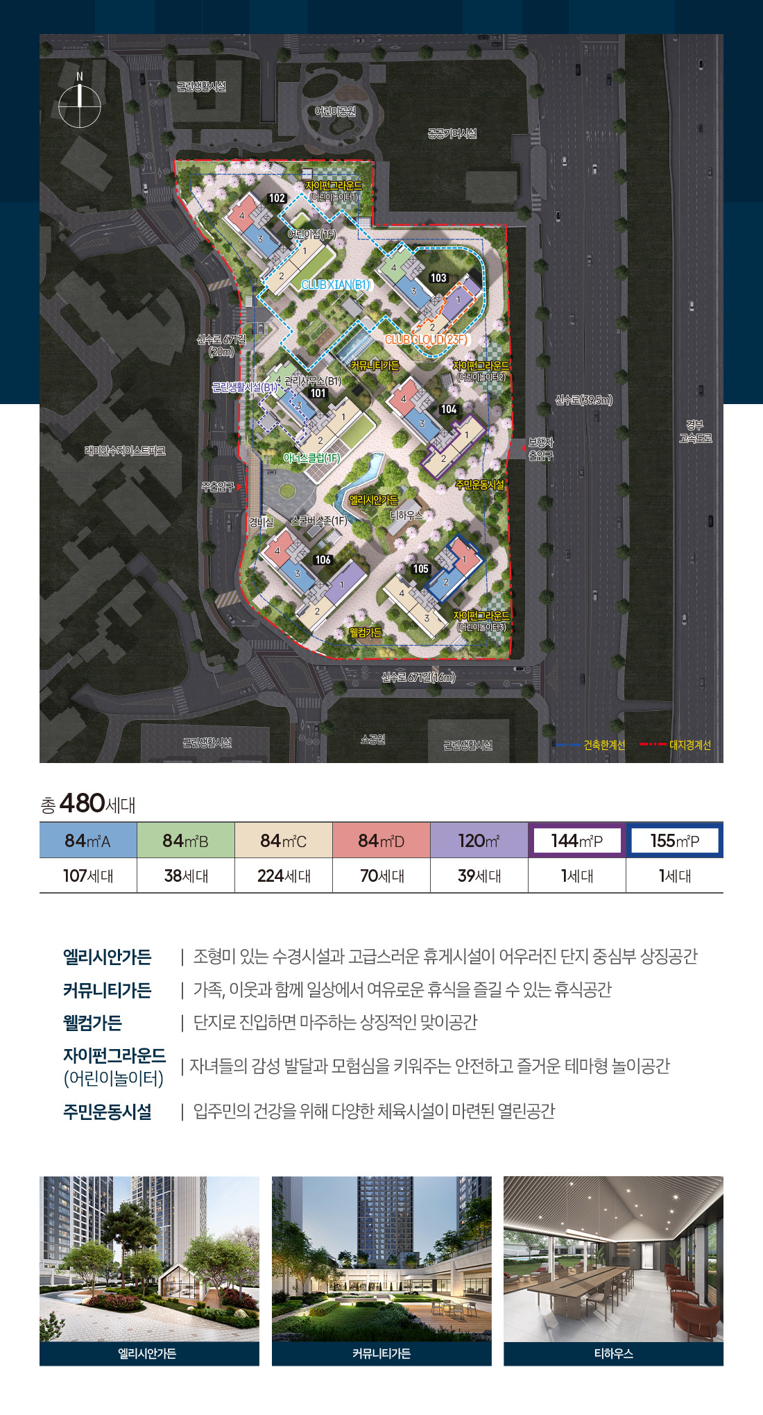 • ※ 단지 외부의 주변 도로 및 기반시설 등은 현재 상황 및 설치 계획을 보여주는 것으로 향후 실제와 다를 수 있으며, 이는 시공사의 시공 범위가 아닙니다.